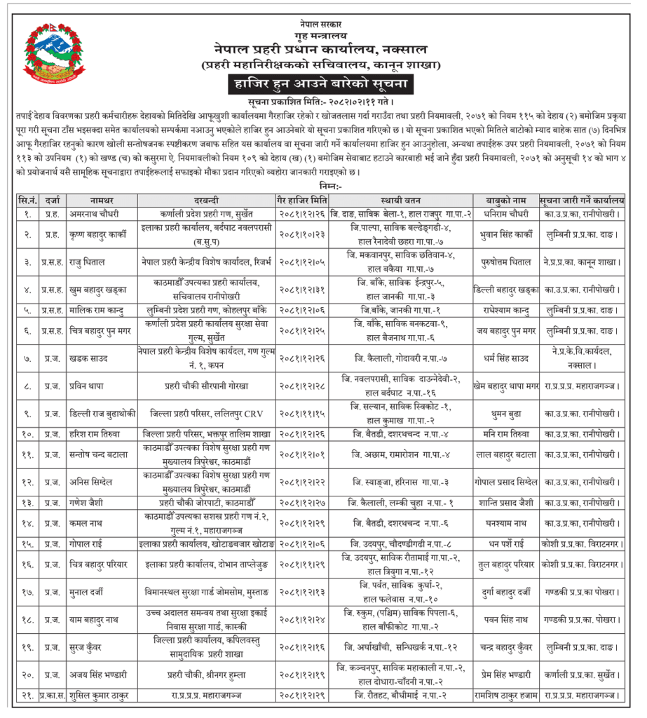 आफूखुसी कार्यालयमा गैरहाजिर रहेको र खोजतलास गर्दा गराउँदा तथा प्रहरी नियमावली, २०७१ को नियम ११५ को देहाय (२) बमोजिम प्रक्रिया पूरा गरी सूचना टाँस भइसक्दा समेत कार्यालयको सम्पर्कमा नआएकोले हाजिर हुन सूचना प्रकाशित गरिएको कानुन शाखाले उल्लेख गरेको छ ।
