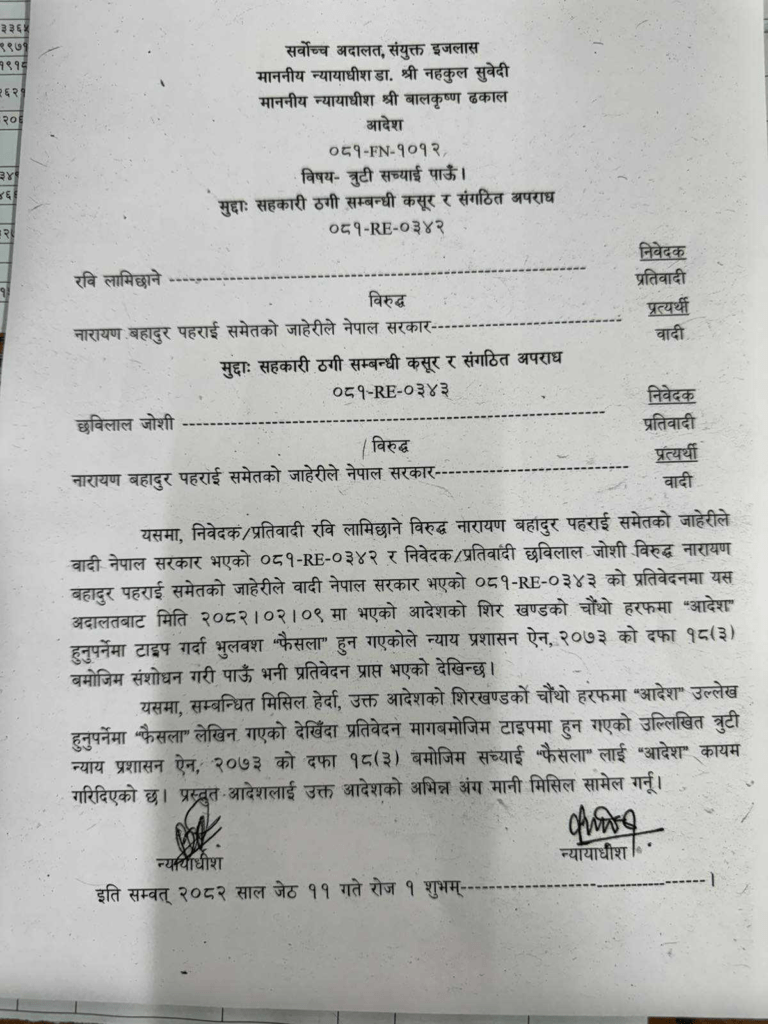 न्यायाधीश डा. नहकुल सुवेदी र बालकृष्ण ढकाललको इजलासले शुक्रबार गरेको आदेशमा भूलवश फैसला लेखिएको भन्दै आज सच्याएको हो ।
