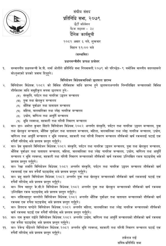 काठमाडौँ :- प्रतिनिधिसभाको बैठक आज (शुक्रबार) बिहान ११ः०० बजे सङ्घीय संसद् भवन नयाँ बानेश्वरमा बस्दै छ ।