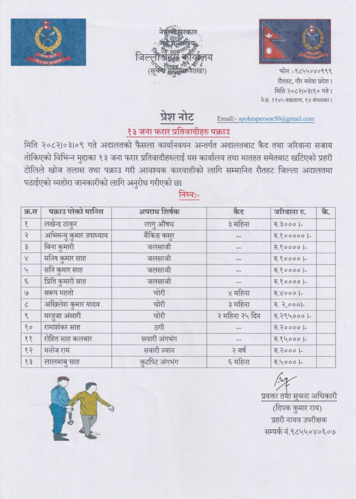 जिल्ला प्रहरी कार्यालय रौतहटका अनुसार अदालतको फैसला कार्यान्वयन अभियान अन्तर्गत विशेष प्रहरी टोली खटाएर फरार प्रतिवादीहरूको खोजी तथा पक्राउ गरिएको हो ।