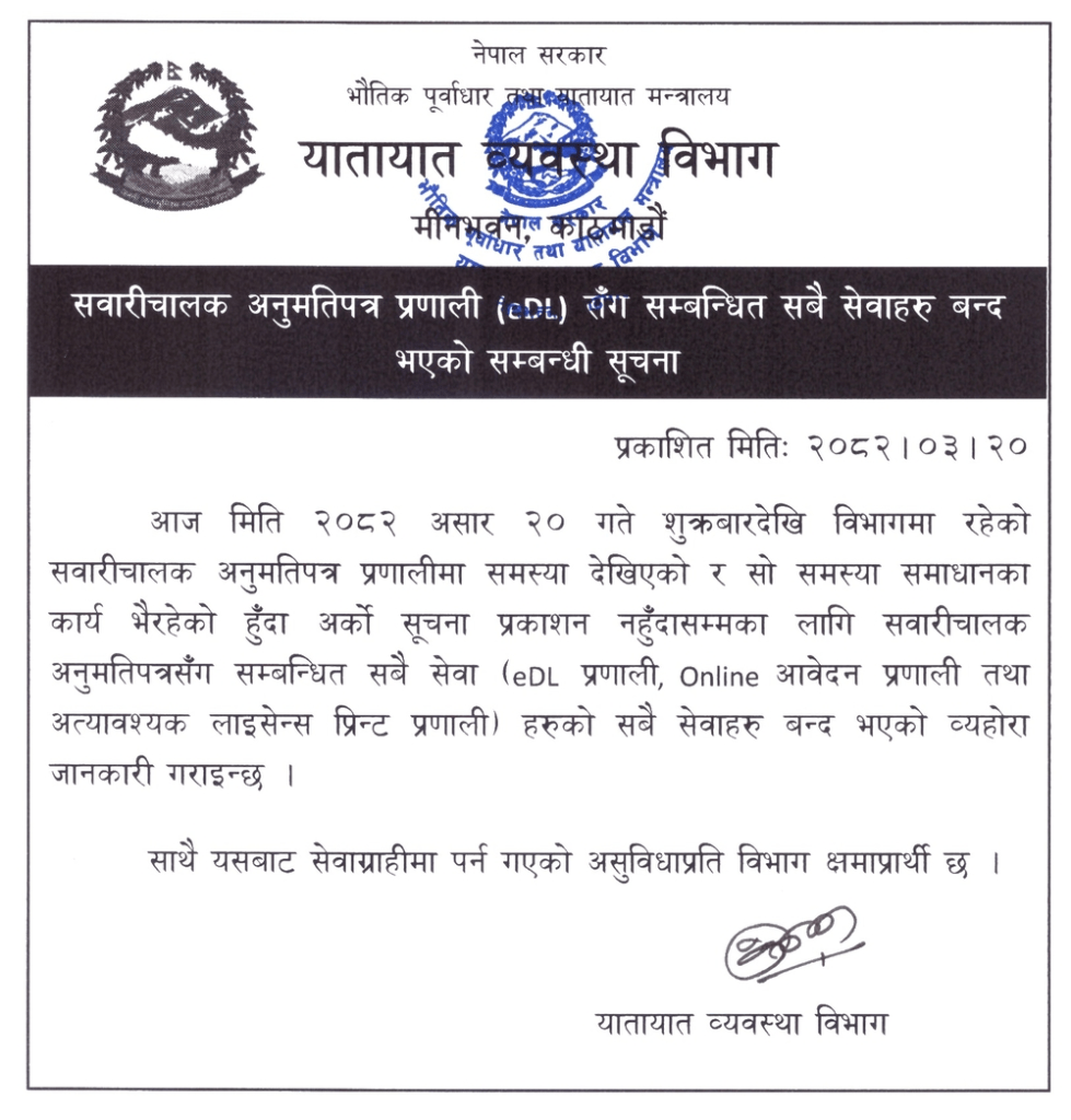 विभागले शुक्रबार सूचना जारी गर्दै सवारी चालक अनुमतिपत्रसँग सम्बन्धित सबै सेवा बन्द भएको जनाएको हो । ‘अर्को सूचना प्रकाशन नहुँदासम्मका लागि सवारी चालक अनुमतिपत्रसँग सम्बन्धित सबै सेवा (ईडीएल प्रणाली, अनलाइन आवेदन प्रणाली तथा अत्यावश्यक लाइसेन्स प्रिन्ट प्रणाली) हरूको सबै सेवाहरू बन्द भएको व्यहोरा जानकारी गराइन्छ,’ विज्ञप्तिमा भनिएको छ ।