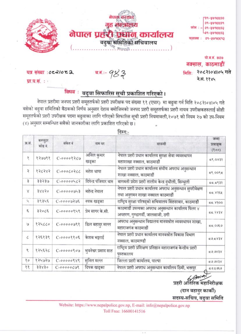 काठमाडौँ :- नेपाल प्रहरीको प्रहरी उपरीक्षक (एसपी) मा बढुवाका लागि ११ जनाको नाम सिफारिस भएको छ ।