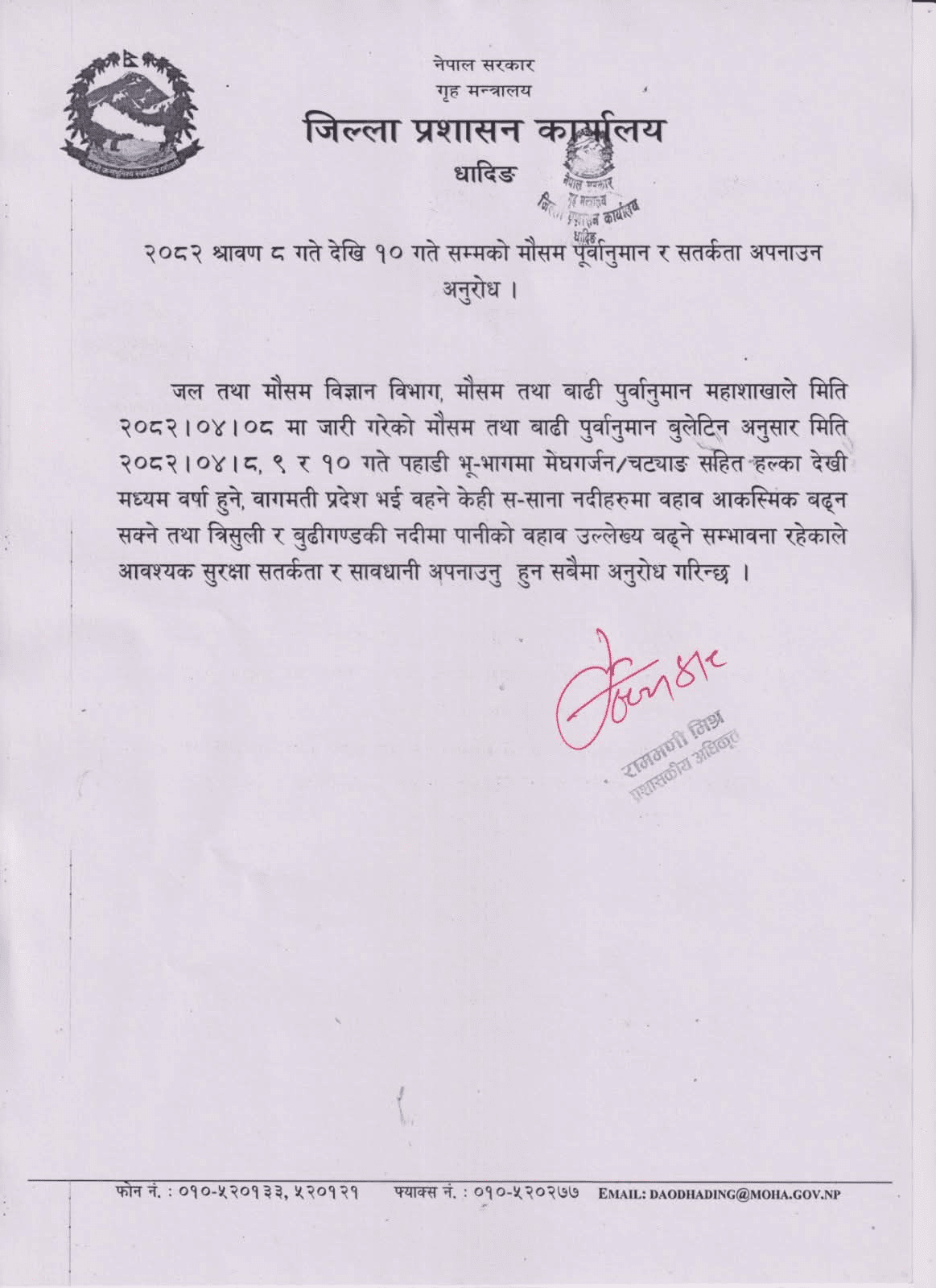 विभागको जानकारीपछि जिल्ला प्रशासन कार्यालय धादिङले सतर्कता अपनाउन आग्रह गरेको छ । आज एक सूचना जारी गर्दै बागमती प्रदेश भई बहने केही स(साना नदीहरूमा बहाव आकस्मिक बढ्न सक्ने तथा त्रिशुली र बुढीगण्डकी नदीमा पानीको बहाव उल्लेख्य बढ्ने सम्भावना रहेकाले आवश्यक सुरक्षा सतर्कता र सावधानी अपनाउनु आग्रह गरेको हो ।