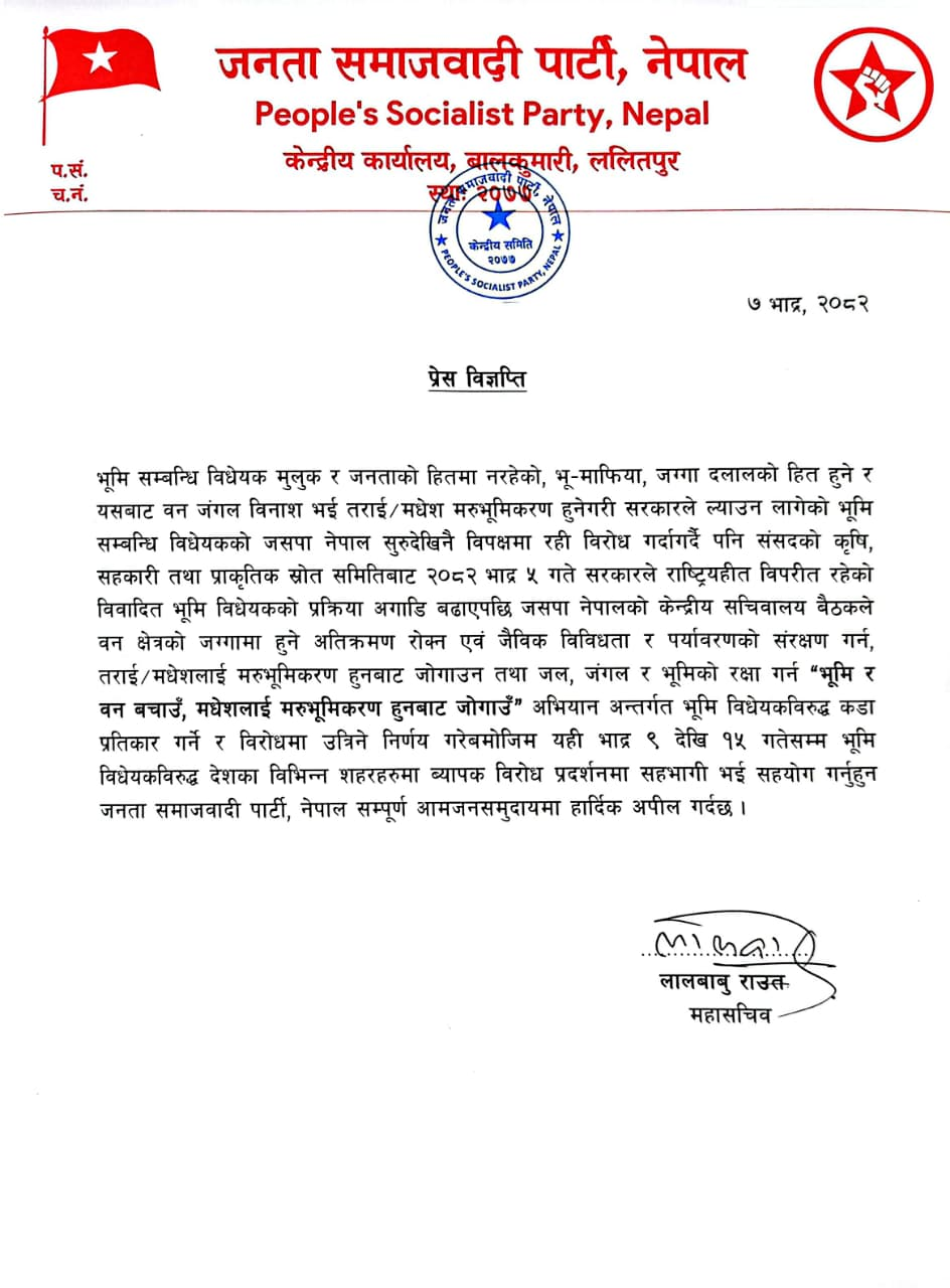 काभ्रे :- जनता समाजवादी पार्टी (जसपा) नेपालले सरकारले ल्याउन लागेको भूमि सम्बन्धी विधेयकलाई मुलुक र जनताको हित विपरीत रहेको भन्दै कडा प्रतिकार गर्ने घोषणा गरेको छ । जसपाले उक्त विधेयक भू–माफिया र जग्गा दलालको हितमा मात्र हुने, वन–जंगल विनाश गरी तराई/मधेशलाई मरुभूमिकरणतर्फ धकेल्ने खालको रहेको आरोप लगाएको हो ।