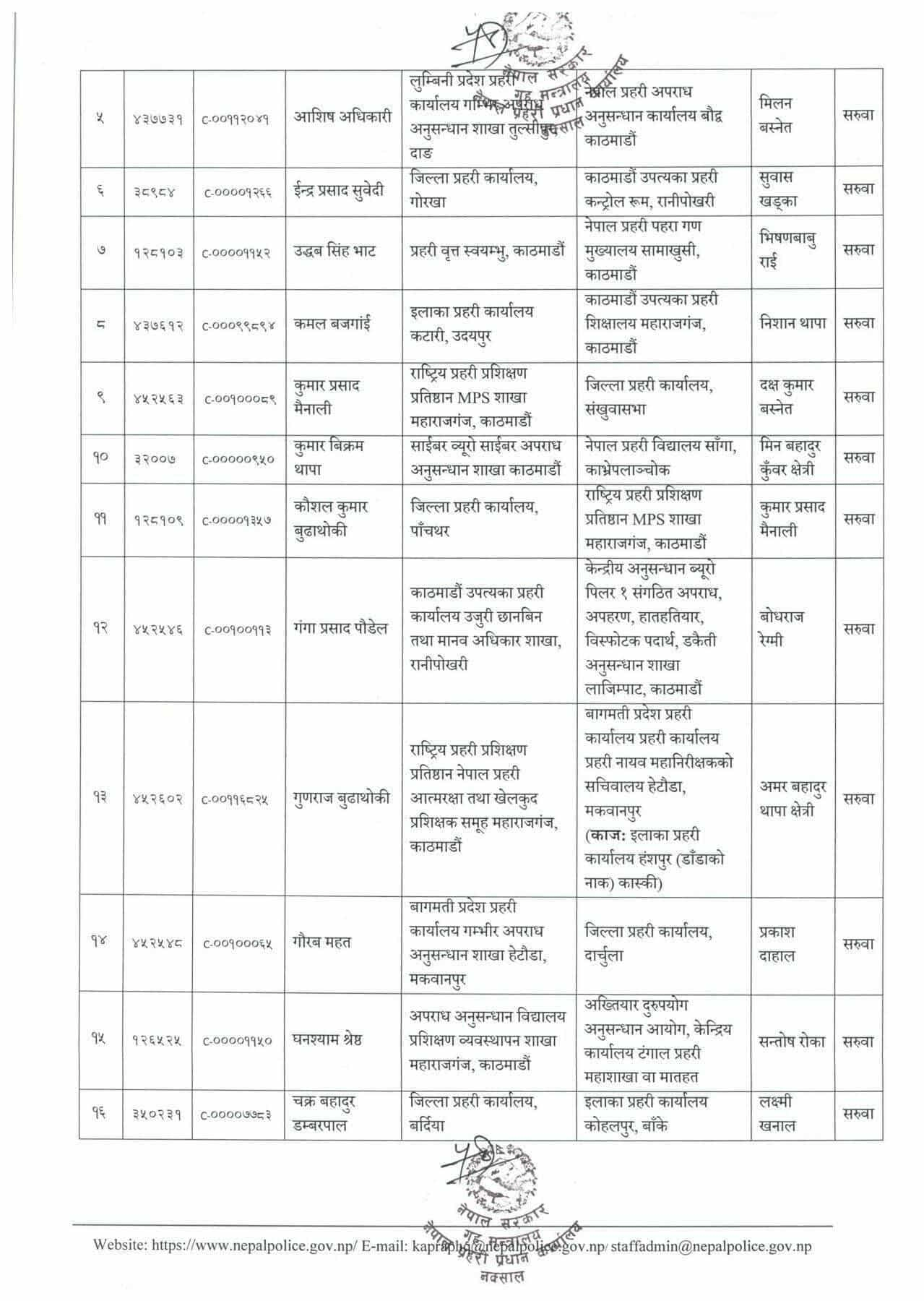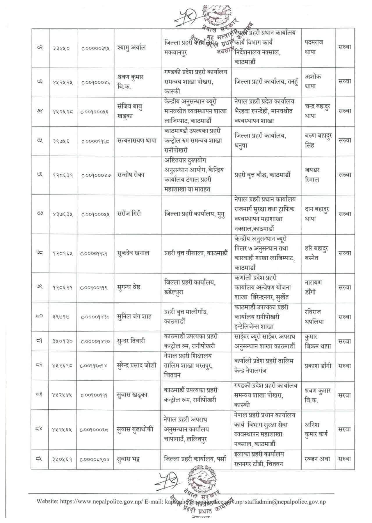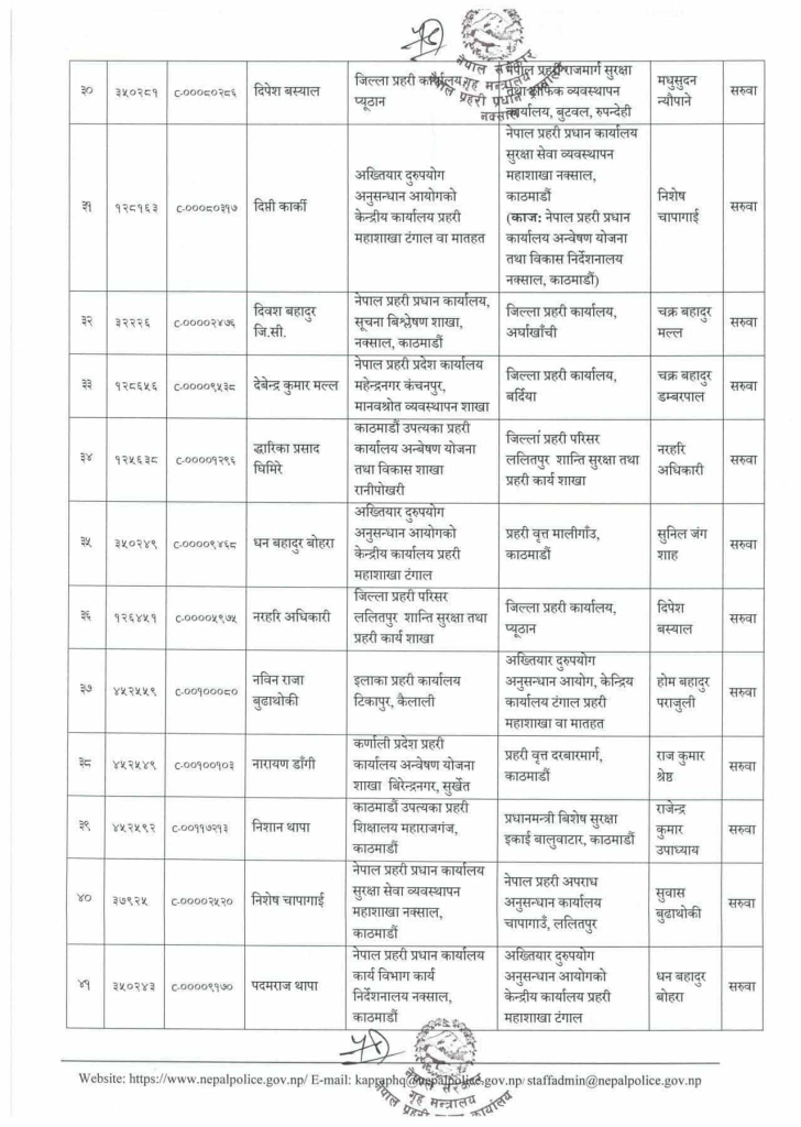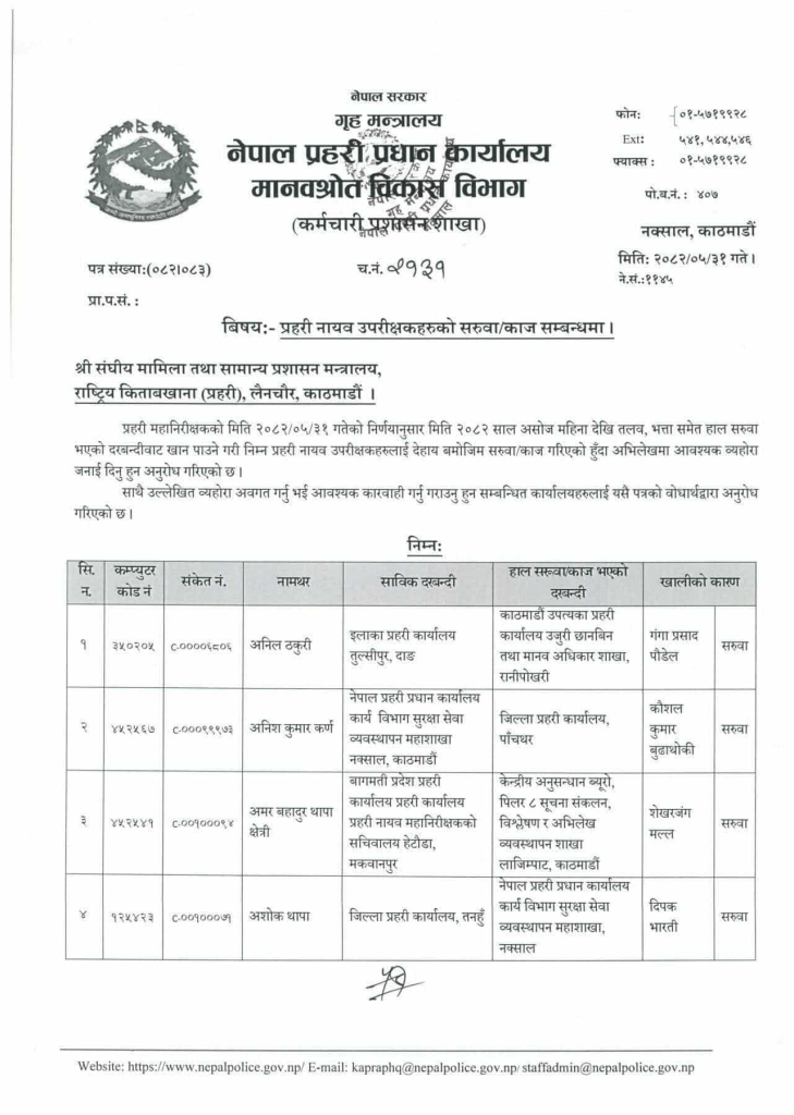 प्रहरी महानिरीक्षकको भदौ ३१ गतेको निर्णयानुसार असोजदेखि तलब, भत्तासमेत हाल सरुवा भएको दरबन्दीवाट खान पाउने गरी सरुवा/काज भएको मानवश्रोत विकास विभागले जनाएको छ ।