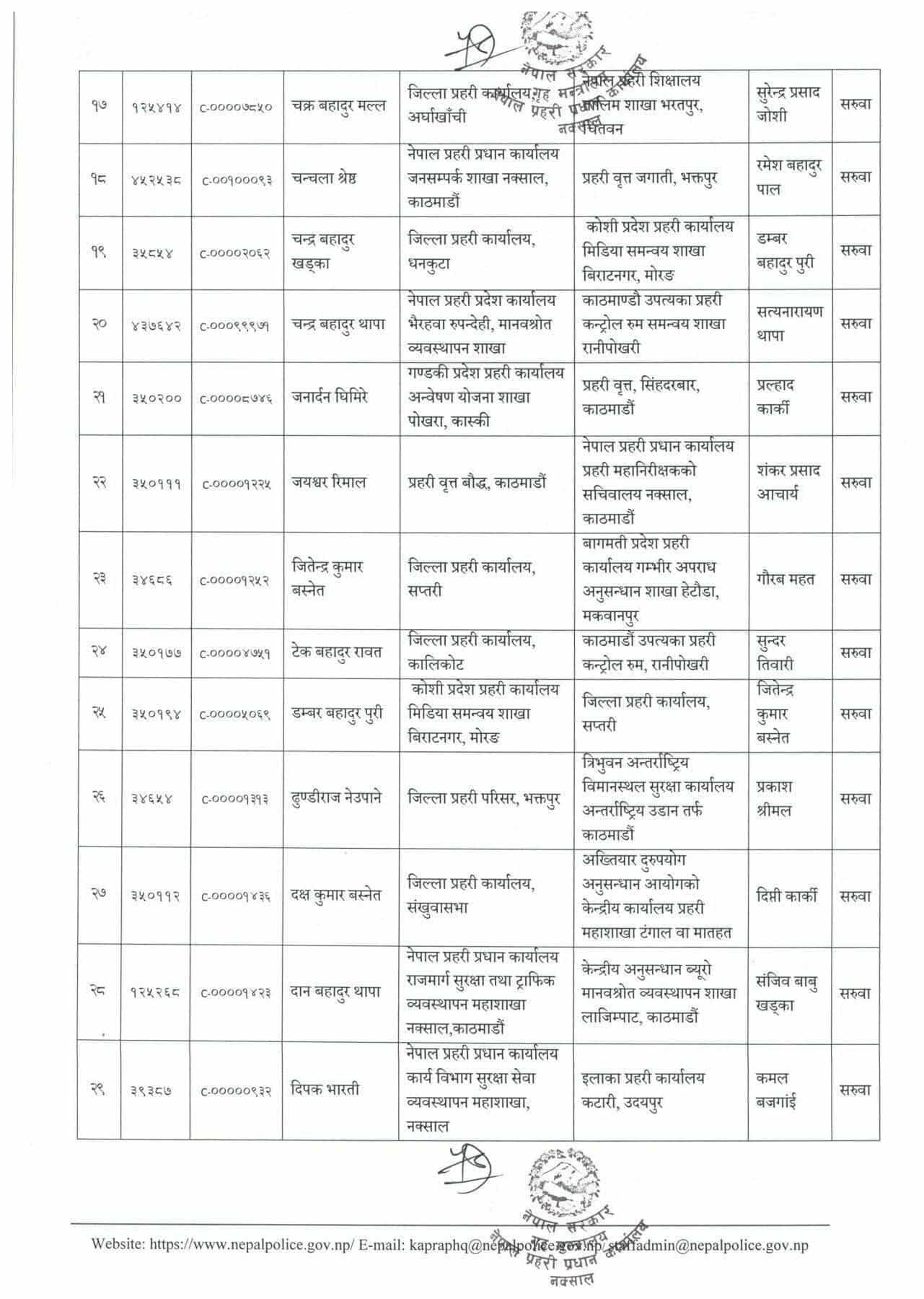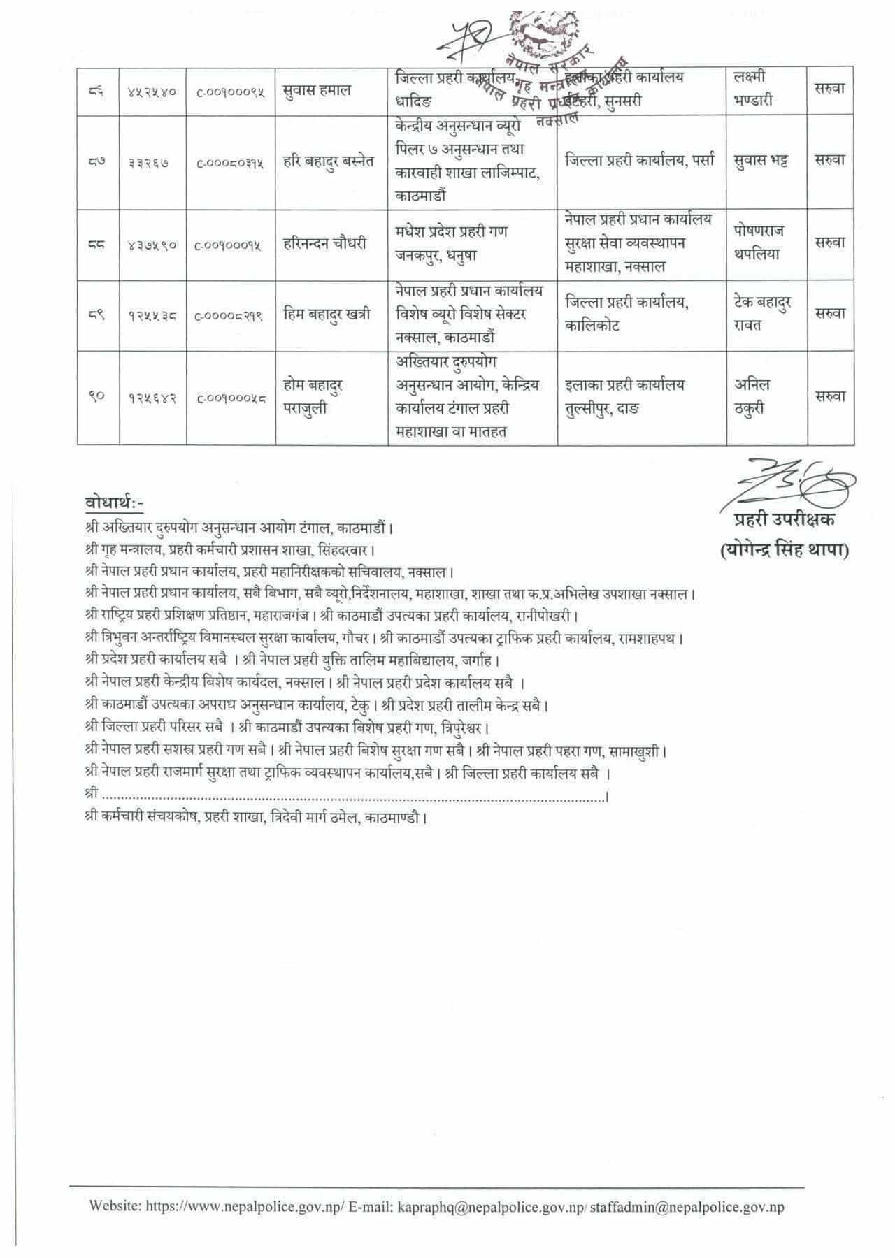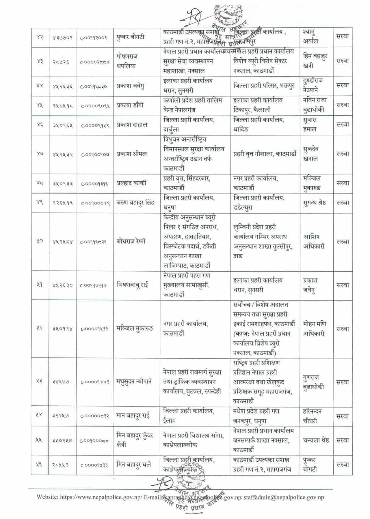 प्रहरी महानिरीक्षकको भदौ ३१ गतेको निर्णयानुसार असोजदेखि तलब, भत्तासमेत हाल सरुवा भएको दरबन्दीवाट खान पाउने गरी सरुवा/काज भएको मानवश्रोत विकास विभागले जनाएको छ ।