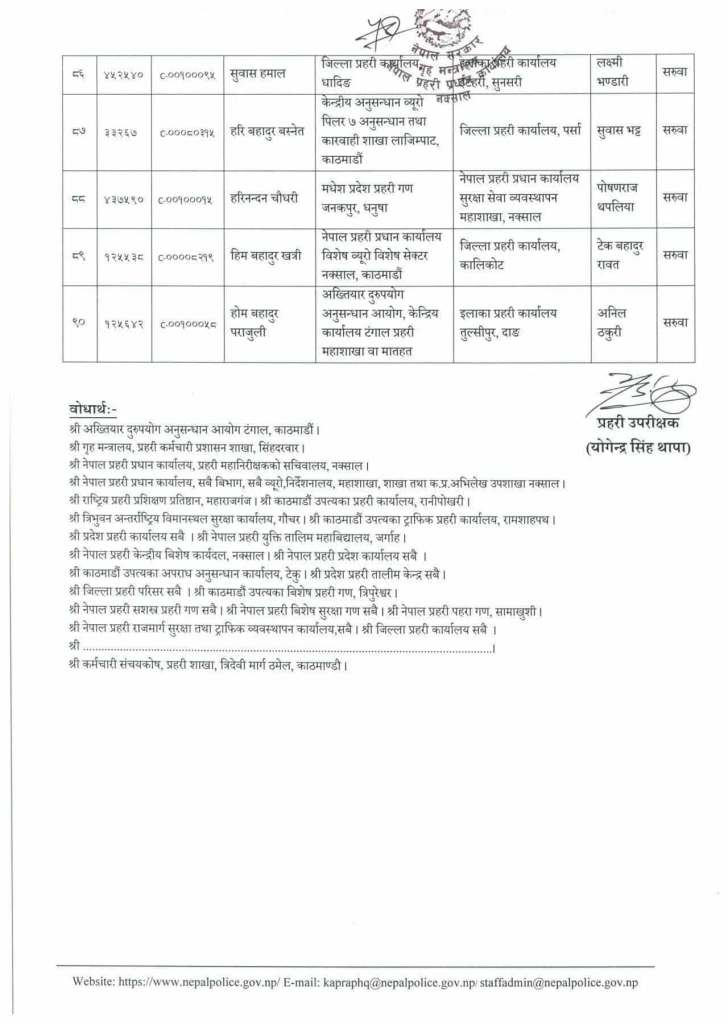 काठमाडौँ :- नेपाल प्रहरीले प्रहरी नायव उपरीक्षक (डीएसपी)हरूको सरुवा गरेको छ । प्रहरी प्रधान कार्यालय मानवश्रोत विकास विभागले एकैपटक ९० डीएसपीको सरुवा तथा काजमा सरुवा गरेको हो ।