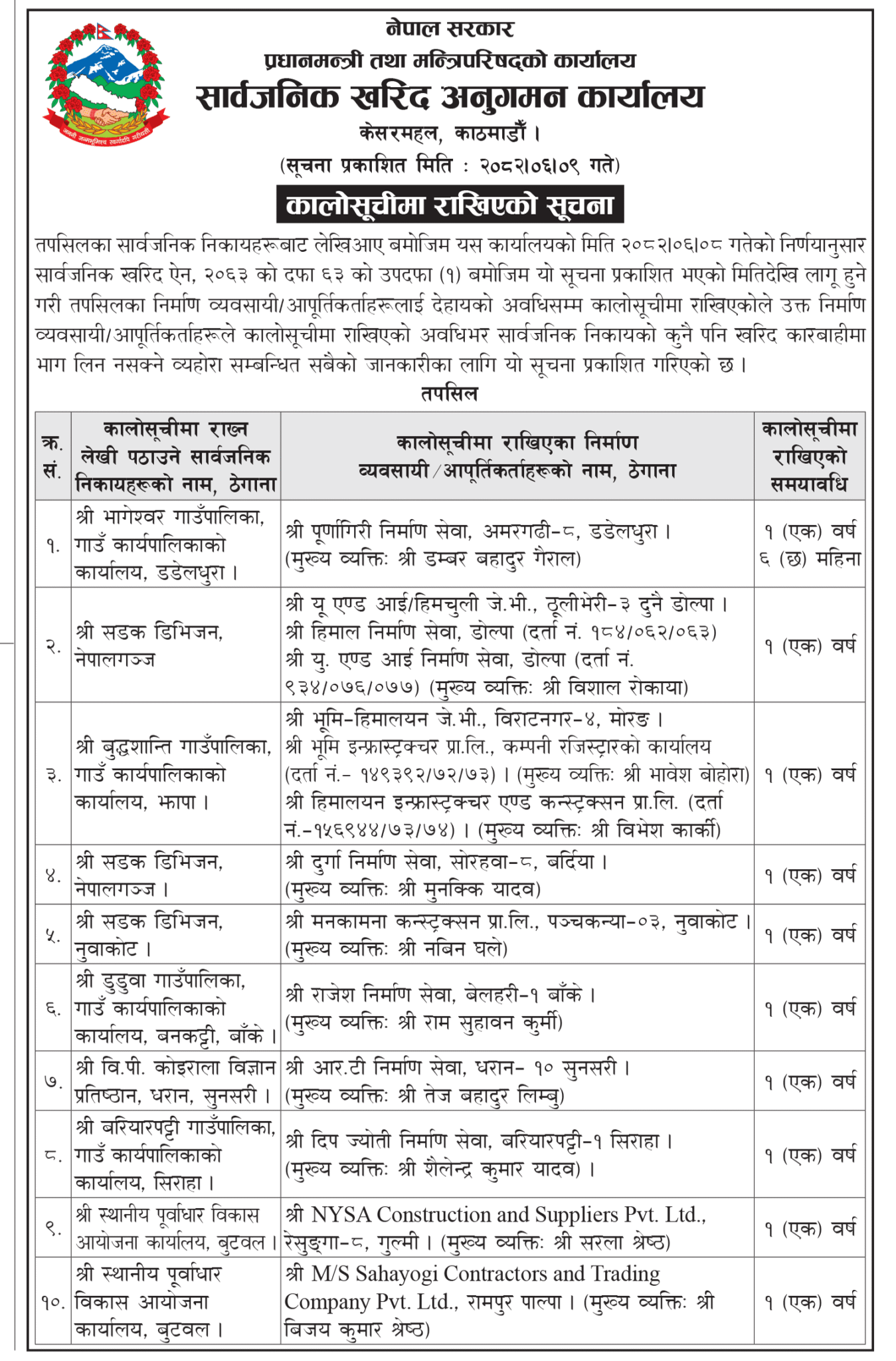 कार्यालयले आज एक सूचना जारी गर्दै असोज ८ गतेको निर्णय अनुसार सूचना प्रकाशित भएको मितिदेखि लागू हुने गरी कालोसूचीमा राखिएका निर्माण कम्पनीको सूची सार्वजनिक गरेको हो ।