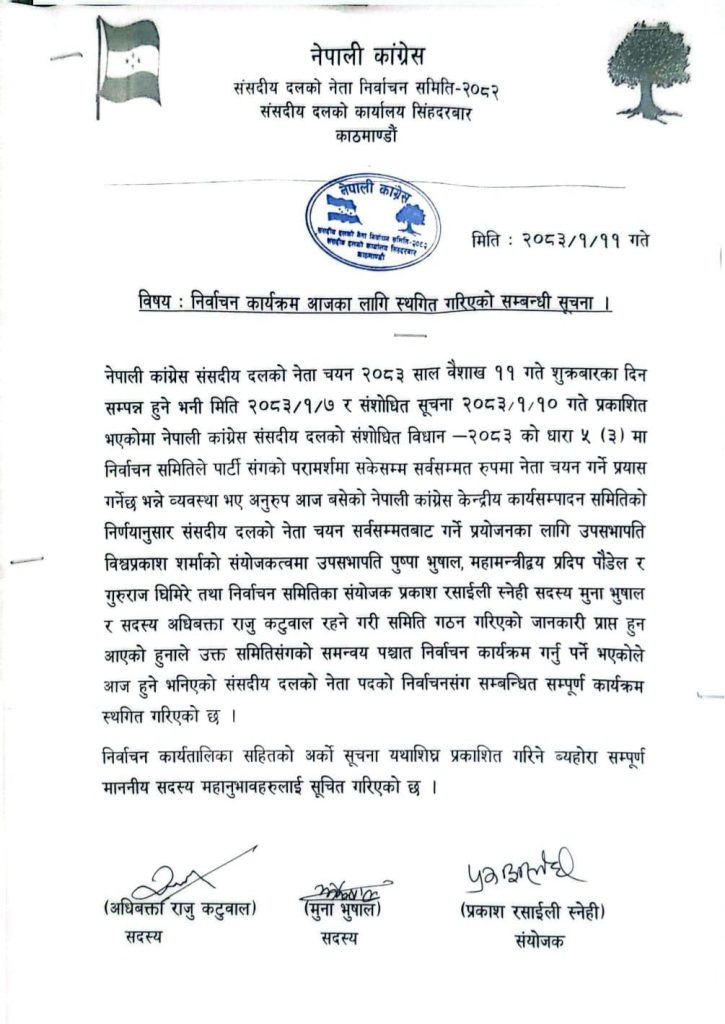 दलको नेता चयनका लागि आज मतदानको कार्यक्रम राखिएको थियो । अन्तिम समयमा आएकर कांग्रेसले निर्वाचन कार्यक्रम स्थगित गरेको प्रेस विज्ञाप्तिम मार्फत जानकारी गराएको छ ।